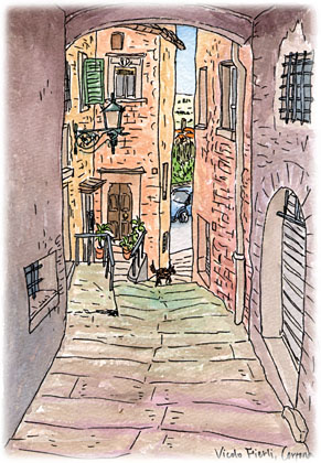 家と家の間に細い路地を見つけて辿って行くと、雨に濡れて うっかりすると足を滑らせそうな急な坂道の向こうに、トスカーナの緑の野がちらりと覗いていました。