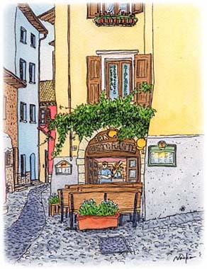 小さな路地の角でスケッチしていたら、ベレー帽のワルターさんに声をかけられました。 彼はマルチェージネ在住の画家さん。そういえば、町中には小さなアトリエがいくつもあります。
