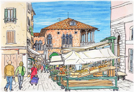 ヴェネツィアへ行ったら一度は覗いてみたいリアルト市場。手前の広場が青空青果市場で、 奥の建物の中が魚市場です。