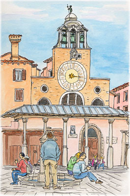 ファサードの大きな時計が印象的なサン・ジャコモ教会。この辺りは ヴェネツィアの最も古い地区です。