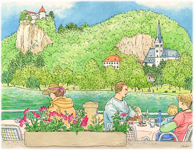 中でもここは、二階のテラスから対岸の聖マルティン教会やブレッド城が真正面に眺められるので、スケッチにも絶好のロケーションです。