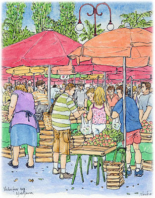 ヴォドニク広場で毎日開かれる青空青果市場。山と積まれた野菜や果物は、日本の物価と比べるととっても安い。 パプリカが100個以上入っていそうな大きな袋詰などは、ハンガリー料理の影響の強いスロヴェニアならでは。