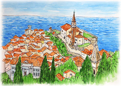 城壁の上、少し違う場所からのラフ・スケッチ。 アドリア海をバックにした町の眺めは、画家でなくても絵に描きたくなる風景です。