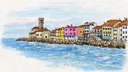 岬の突端に建つ石造りの塔は灯台です。 町の中心からこの灯台までの海沿いの道には、何軒ものシーフード・レストランが並びます。 観光客向けのちょっと値段の高い店が多いと聞きましたが、それでもヴェネツィアの半額くらい。 アドリア海を渡ってくる海風に吹かれながらテラス席で味わうシーフードは絶品です。