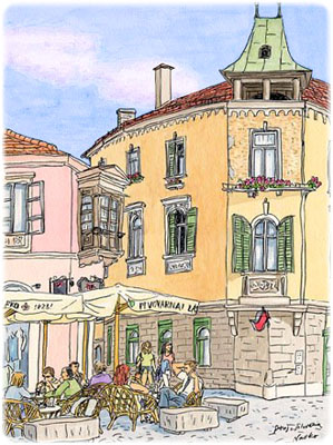 町の中心広場のオープンカフェで一服。案内してくれた友人に、スケッチしたいからちょっとだけ時間をちょうだい! と頼んで、友人が買い物に行っている間に大急ぎで描きました。