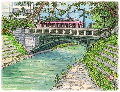 松川べりは、春は桜の並木道になります。橋の上を路面電車が渡って行きます。 街歩きに倦んだ時、ちょっと心休まる散歩道です。