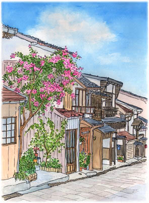 諏訪町通りは、古い町並みを残しています。おわら風の盆では、この通りを踊り手と地方(じかた)が流してゆくそうです。