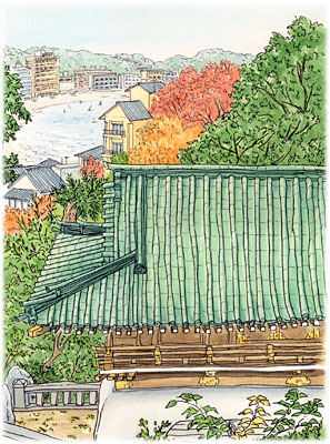 息を切らして石段を上り振り返ると、青銅の屋根の向こうにちらりと海が見えました。ここを描こう、と決めました。