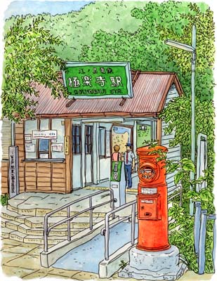 緑に囲まれた小さな駅と赤い円筒ポストが絵になります。
