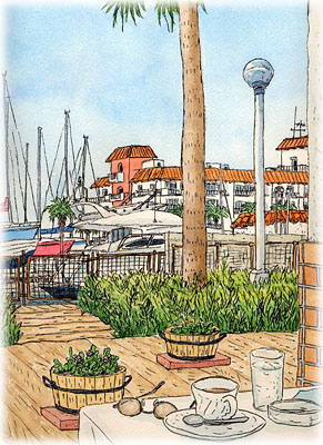 逗子マリーナにて。こちらは暖かいカフェの中からのスケッチです。