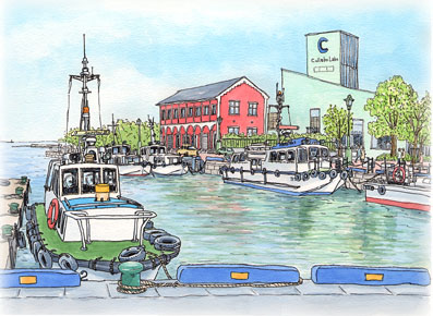 公園の中はあまりの喧騒で落ち着かないので、ちょっとはずれた静かな波止場で描きました。
