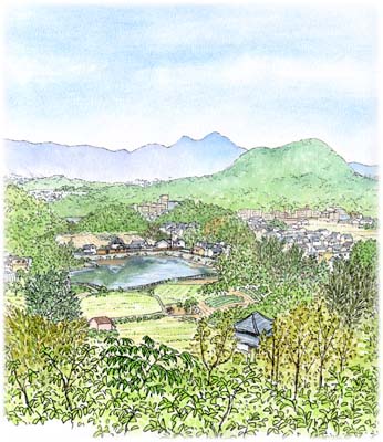 甘樫の丘からは、大和三山の香具山、畝傍山、耳成山が見渡せます。 和田池の向こうに見えているのは畝傍山。遠くには、二上山が霞んで見えます。
