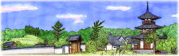 この塔と、周囲に広がる斑鳩の里の田園風景を描いてみたいと思いレンタサイクルで走り回りましたが、なかなかよい場所が見つかりません。 遂に畑の畦道に乗り入れて、畑の真ん中からの眺めを見つけました。