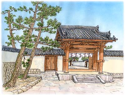 いつ訪ねても観光客や修学旅行生でいっぱいの法隆寺ですが、この西門の周辺はいつも人影が少なく、ひっそりとしています。 ここから藤ノ木古墳に至る西里は、古い土塀の続く趣のある町並みです。