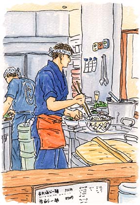 元町のラーメン屋さん「本丸亭」。ちょうど座ったカウンター席から厨房の様子がよく見えました。 目の前で麺を茹でたり菜を刻んだりする料理人たちの姿がなかなかよかったので、麺が伸びないうちに大急ぎで描きました。