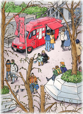ここはいろんなものが溢れていて、一見何でも描けそうなのですが、いざ描こうとすると意外と描くものが定まらないところです。 結局、クィーンズパークのクレープ屋さんの赤い車を、2階デッキから見下ろして描くことにしました。 日が陰るとかなり寒い日で、枯れ枝を晒した木々の向こうに覗いて見える赤い車がなんとなく温かそうで・・・。