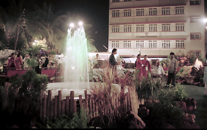 インドの結婚式はホテルの中庭を利用したガーデン・ウエディング。飾り付けもかなり派手、もちろん食べ放題・飲み放題です。せっかくだから何か食べてくればよかった。