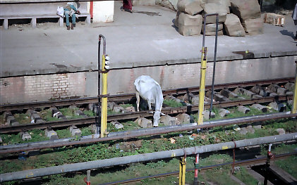 草ぼうぼうで廃線のようですが現役の線路です。面白いのはあちこちに牛がいること。ヒンドゥー教では牛は聖なる動物とされており、駅だからといって邪険にできないのです。列車が来たらどうするんだろう。さて、ここで車をチャーターしバラナシへ。玄関口というよりは隣街。けっこう距離がありました。
