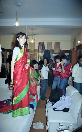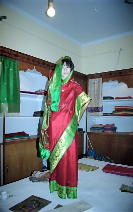特に絹織物が名産とのことで、直売工場の見学に出かけました。到着するなり女性陣の周りにはお店の人が集まり即席のファッションショーの始まり始まり。サリーは一枚の布から出来ており、それを体に巻いていくのですが、素人には意外に難しい。