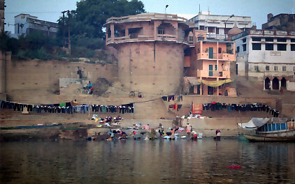 岸辺の寺院らしき建造物。でも、ちょっと待て、何かがおかしい。ねえ、これ傾いてない?傾いてるよねえ。目を凝らして見ましたが間違いありません。地盤沈下か、建築ミスか、それとも大地震でもあったのか。インドっぽいといえばインドっぽいんだけど。