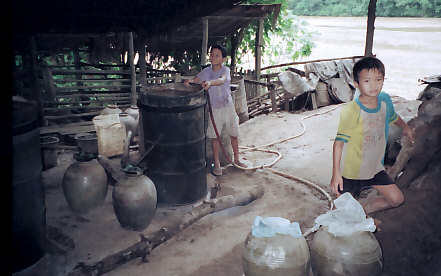 ラオスの酒「ラオラーオ」を製造しているバーン・サンハイ村。意外なことに酒造りは子供の仕事です。水を汲み、火をおこし、大きな樽で蒸留し、けっこうな重労働です。