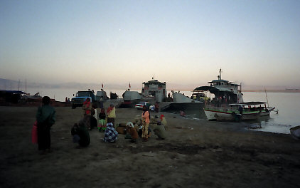 ちょうど対岸からの一番船(?)が到着していました。何しろ川幅が広いので、日本の下手な漁船よりよっぽど大きな貨物船です。その割に桟橋は海水浴場のバナナボート並みに小さく、ほとんど砂浜に乗り上げるように着桟します。砂にめり込んじゃったら、離岸するときはどうするんだ?