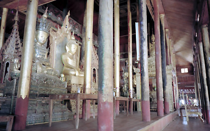 これがインレー湖名物、世にも珍しい水上に浮かぶパゴダ。水草を集めた島の上に建っているとは思えないほどしっかりとした造りです。歩いてても全然揺れないんだから。