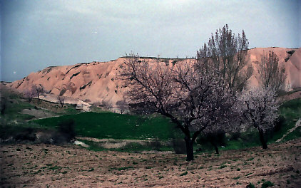 カッパドキアを一躍有名にした光景がこれ。しめじのような、白い体に黒い帽子をちょこんとかぶせた三本の親子岩が並ぶ眺めは、絵葉書などでもおなじみの構図ですね。題して「妖精の煙突(ペリバジャ)」。カッパドキアの奇岩は概してみなペリバジャと呼ばれることも多いのですが、この岩が本家です。近くには試飲もできるワイナリー「トラサン」があり、こちらもオススメ。日本円で600円程度の値段で、信じられないくらい美味しいワインを買うことができます。瓶の形が「妖精の煙突」そっくりなので、お土産にももってこいです。