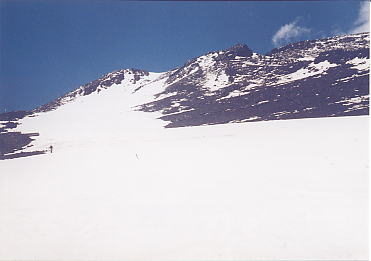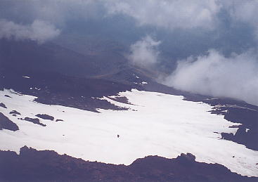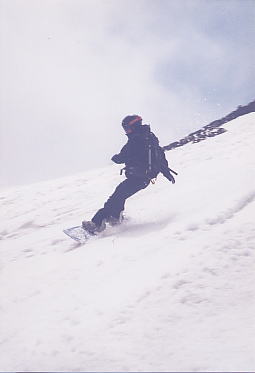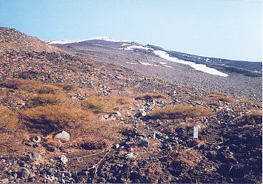 6合目から山頂を望む。雪は7合目までつながっている。 8合目より見下ろす。 8合目小屋裏より山頂。すばらしい斜面が広がっている。 上部はザラメの深雪。 rider:float-decko