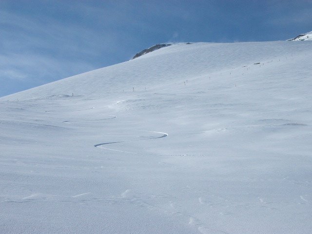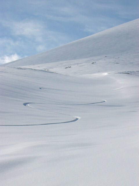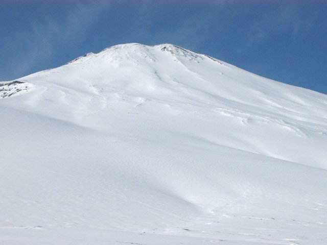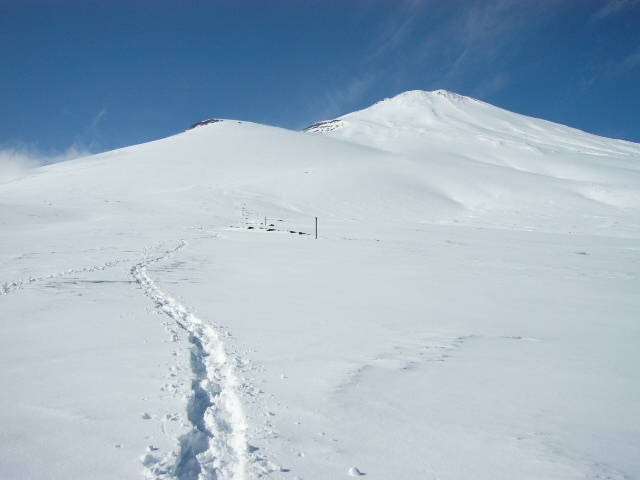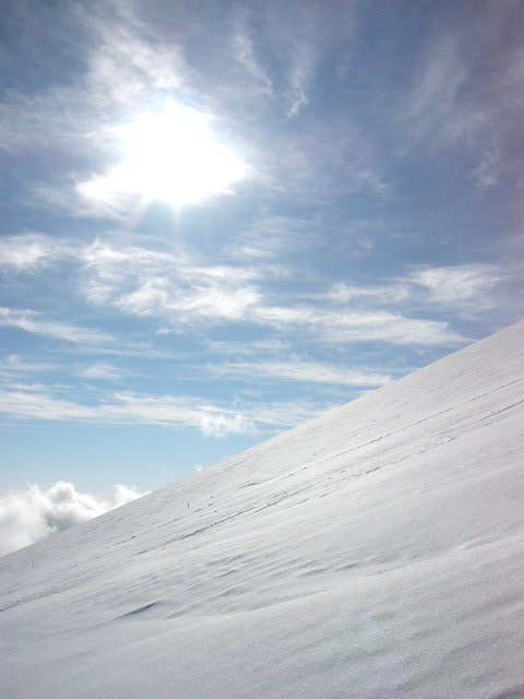 大石茶屋付近から。 良い天気。下界は雲の中。 宝永山と自分のトラック。 こんな感じのナチュラルパイプもあって楽しい。 トラック。 真っ白な富士山。でもこの時期、上部はアイスバーンでかなり危険。