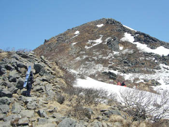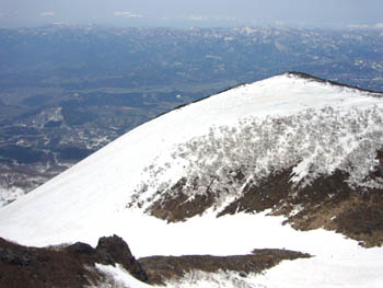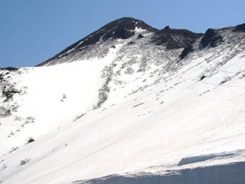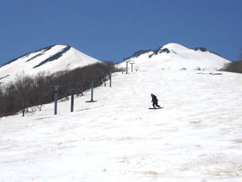 あとはゲレンデを駐車場まで。右のピークが岩木山。左が鳥海山。