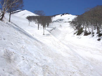 百沢スキー場上部で沢の左岸に上がり、ゲレンデへ。