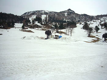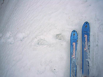 クローズした山田牧場スキー場からハイクアップ。今日はテレマークです。 ゲレンデTOPから。ところどころ土が見えていますが、面も綺麗で滑るのには問題なし。 林道で見つけた熊の足跡。この先、必要以上に音を鳴らして前進。 上部は結構な急斜&クリフ&密なツリー。山頂まで登ってもテレマークの足前では、まともに滑れません(笑)
