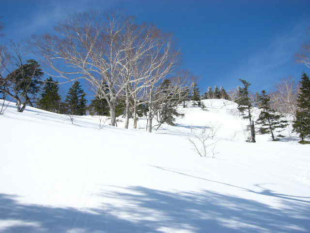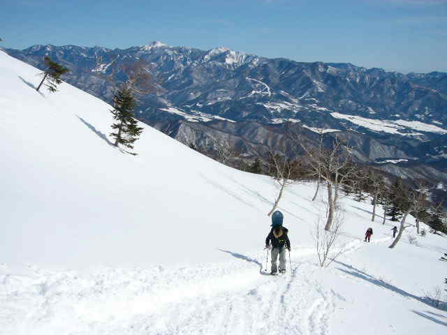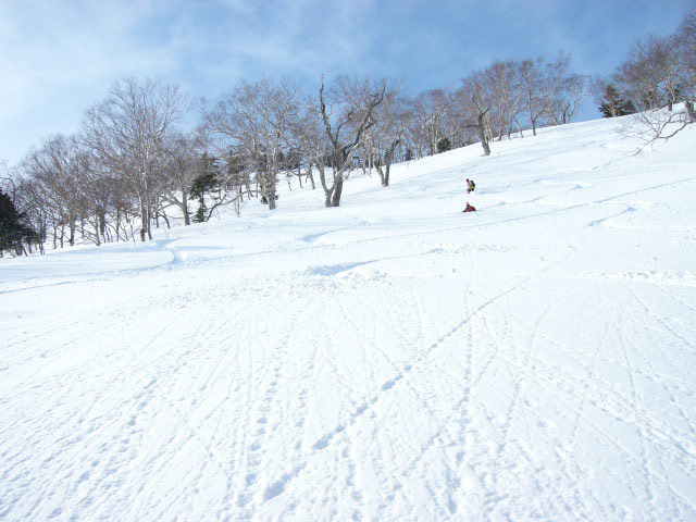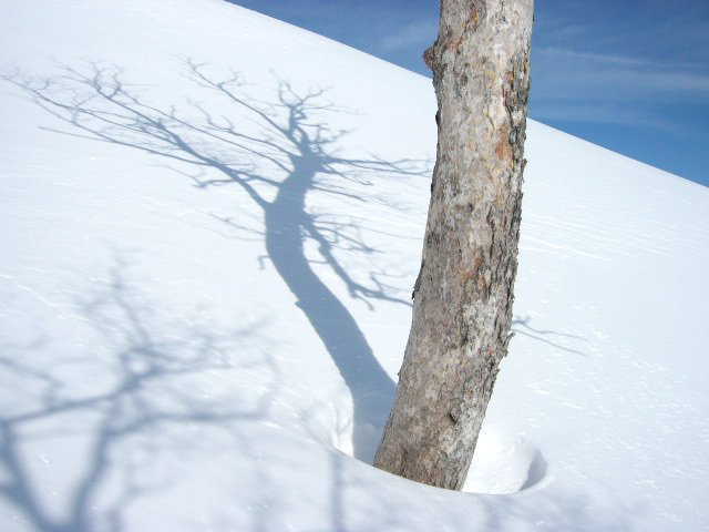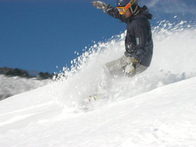 前武尊。手前はノートラックのゲレンデ。 快晴の良い天気。 雪面に落ちる木陰。 遠く富士山まで見えました。 後は日光白根山。トレースをはずすと、スノーシューをつけていてもヒザまで埋まる。 山頂から剣が峰。 こんな感じの斜面。30度くらい。 板の良く走る、締まったパウダーで踏み込むとオーバーヘッドのスプレーが上がる。 rider:K.K こっちはゲレンデ。おまけ。 rider:K.K