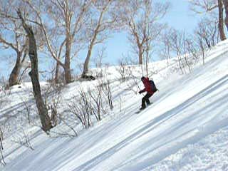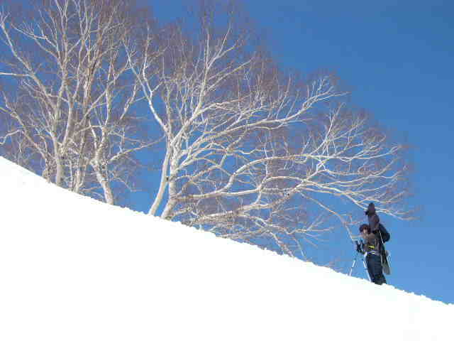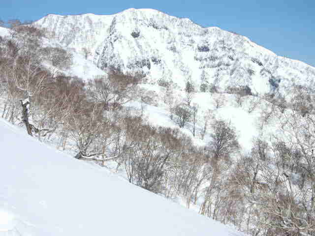 雪庇の張り出した神奈山。 ドピーカンの尾根を登る。 北斜面は締まったパウダー! rider:float-decko rider:kume-san 山頂からは妙高山が大きい。ここから標高差1000mのダウンヒル。