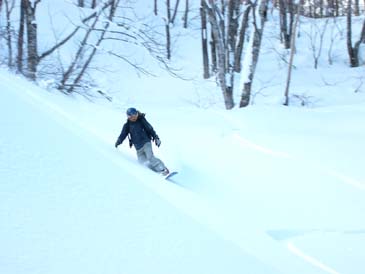 シーズン初めということで、ブッシュが埋まりきっていないものの上々のコンディション。 南岸低気圧接近前の晴れ間を狙って。 上部は締まったパウダー。 rider:K.K ツリーの中は良い感じのパウダー。rider:T-san rider:K.K