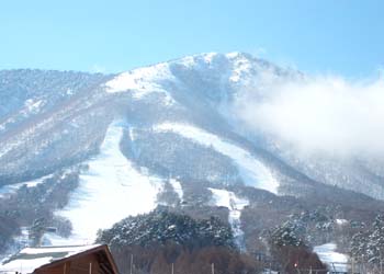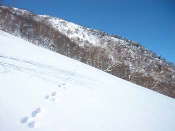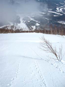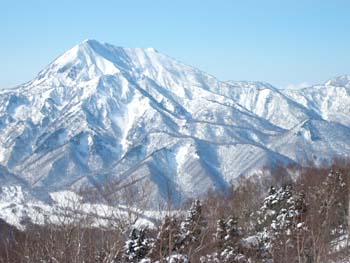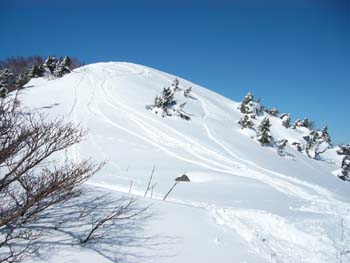 市街地からも良く見える、オープンバーン末端から見上げる山頂。 霊仙寺山のピーク。 高妻山。山頂は360度の展望。 中腹からゲレンデを見下ろす。 駐車場から滑ったラインを振り返る。