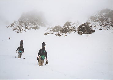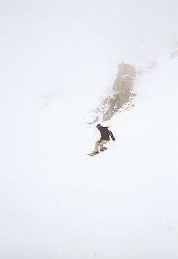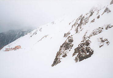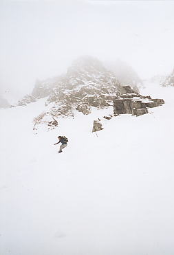 5月だというのに前日の積雪は20cm。 ただ、ごらんのように上部のガスが取れなくて今回、極楽平方面の滑走はできませんでした。 オットセイ岩付近から、ホテル千畳敷。 rider:mutoh-san rider:kudo-san