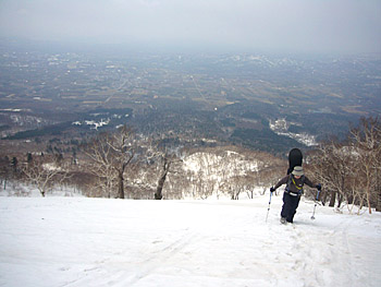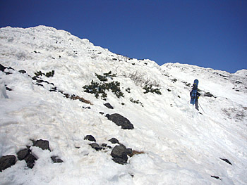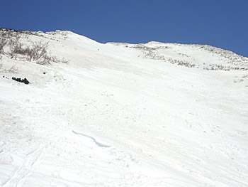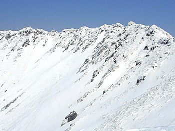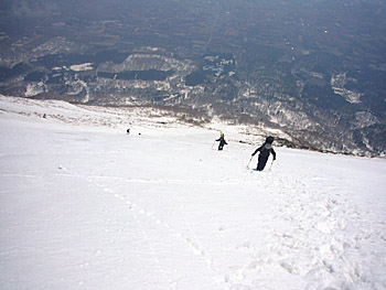 頂上直下のロックバンドをすり抜ければ快適な斜面に。