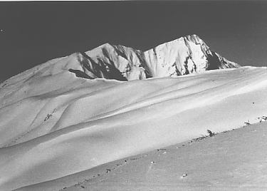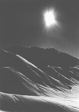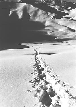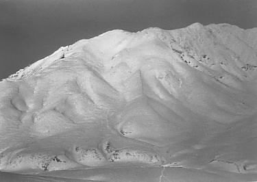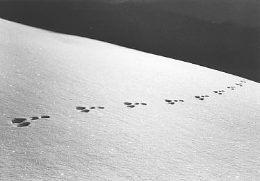 立山の玄関口である室堂へは、体力を使わずしてたどり着いてしまいますが、一歩外へ踏み出せば、そこはエキスパートの世界です。常に、慎重な行動を心がけましょう。 アニマルトラック(ウサギ) j自分の足跡。 雪面に落ちる影。 雷鳥沢から立山三山。台形の山容の左から富士ノ折立、大汝山、雄山。 雷鳥沢から大日岳。 雷鳥荘前からの雷鳥沢。標高差500m、滑走距離2kmの広大な斜面。