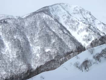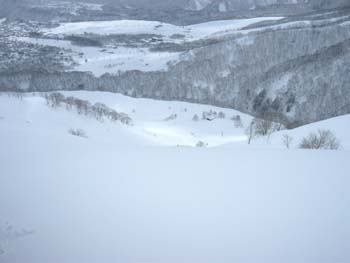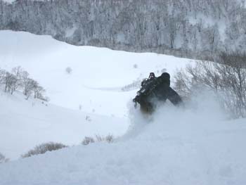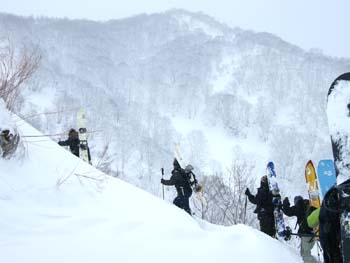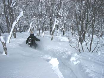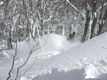 あのピークを目指してハイク。 左手に鵯峰。 最初のドロップポイント。 オープンバーンに吸い込まれていきます。 rider:eiji-kun ピークからツリーにドロップ。 3月でも膝上のパウダー!
