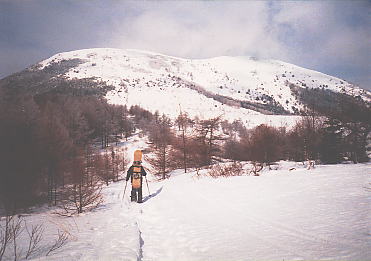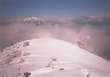 湯の丸山は南峰と北峰があって、山頂の標識は北峰にある。 この日はトレースがしっかりついていたので、登山道をはずさなければ、つぼ足でOKでした。