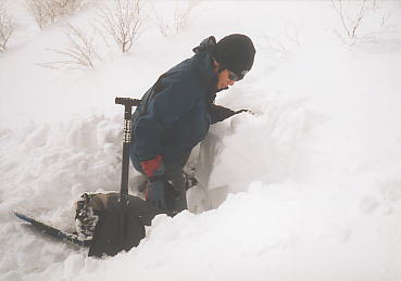 山頂直下で、お約束の穴掘り(弱層テスト)。積雪は1〜1.5mほどでしょうか。