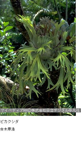 ビカクシダ コウモリランとも。オーストラリア原産のウラボシ科の着生シダ。観葉植物として温 室内で栽培。裸葉(栄養葉)は皿状で樹幹に重なり合って密着し,そこからシカの角 状に先の分岐した,胞子をつける実葉を出す。ジャワ原産のナガバビカクシダは長さ 1mにもなる実葉を下垂する。