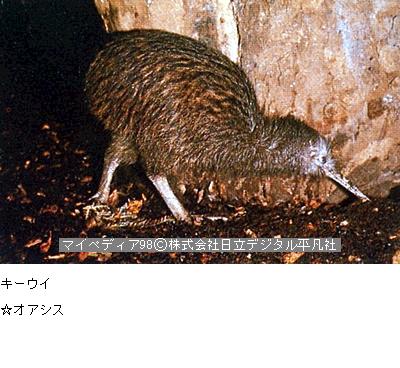 キーウイ キーウィ科の鳥の総称。3種ある。大きさはニワトリくらい。翼や尾は小さく,そ の部分の羽毛も体羽と変わらず,飛べない。くちばしは長く,鼻孔はその先に開口。 ニュージーランドの山地森林にすみ,夜行性。おもにミミズを食べる。木の根もとな どに穴を掘り草などを敷いて1〜3卵を産む。卵は白色で,鳥の体に比して大きく, 親の体重の4分の1にも当たる。 前のページへ もどるB部分の羽毛も体羽と変わらず,飛べない。くちばし は長く,鼻孔はその先に開口。ニュージーランドの山地森林 にすみ,夜行性。おもにミミズを食べる。木の根もとなどに 穴を掘り草などを敷いて1〜3卵を産む。卵は白色で,鳥の 体に比して大きく,親の体重の4分の1にも当たる。
