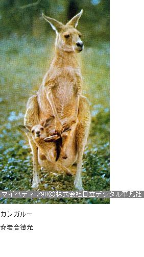 カンガルー 有袋目カンガルー科の哺乳類の総称。後肢と尾が発達。太くて長い尾ではずみをつ け,ジャンプして前進する。オーストラリア,ニューギニア,タスマニアに分布。草 原や疎林,熱帯多雨林にすみ,草食。ふつうは1腹1子,ニオイネズミカンガルーで は1腹2子。新生児は0.3〜1gほどで,ミミズのようなぜん動運動をして育児嚢に入 り込み,3〜6ヵ月を嚢内で過ごす。アカカンガルー(体長0.8〜1.6m),オオカン ガルー(ハイイロカンガルーとも。体長1〜1.5m)などが代表的。やや小型のものを ワラルー,さらに小さなものをワラビーといって区別するが系統的には同類である。 皮はじょうぶなため靴などに利用される。 もどる