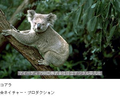 コアラ コモリグマとも。有袋目コアラ科の哺乳(ほにゅう)類。体長雄80cm,雌70cmほど。毛 は羊毛状で灰色〜黄褐色。あご,胸,四肢の内側は白色。オーストラリア南東部に分 布。森林の樹上にすみ,ユーカリの葉や芽だけを食べる。普通1腹1子,妊娠期間35 日ほど。離乳期に母親は子に肛門から出す一部消化された葉を食べさせる。毛皮が良 質のため乱獲されたが,現在では保護されている。 もどる