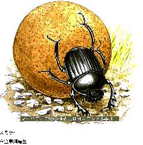 スカラベ 別名タマオシコガネ,フンコロガシ。コガネムシ科の甲虫の一群の総称。オオタマオ シコガネは体長25mm内外,黒色。地中海沿岸〜中央アジア,中国に分布。獣糞(ふん) を球にして運搬し,地中に埋めて食糧にする。この類はファーブルの《昆虫記》で有 名になった。乾燥地方に多い。古代エジプトではスカラベは太陽神ケペリの象徴とし て崇拝され,これをかたどって護符とした。護符は貴石や陶器などで作られ,装飾品 や印章としても用いられた。ミイラの心臓の上に置かれたものは,復活を祈願すると いう意味をもつ。日本には1種もいないが,体長2〜3mmと非常に小型のマメダルマ コガネがときに小糞塊を運ぶといわれる。 ![]()