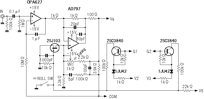 そこで図6を眺めると、入力バッファーの反転入力側が御誂え向きにDC全帰還が掛けられることに気付き、図7のように改良しました。