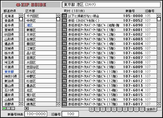 ●使用方法について まず、調べたい郵便番号の都道府県をクリックします。つぎに市区郡等を クリックします。すると該当する町村名が表示され、対応する新旧郵便番 号のリストが表示されます。 町村名の前のカナの部分をクリックすると選択した都道府県市町村の読み カナがクリップボードにコピーされます。 町村名の部分をクリックすると都道府県市町村が漢字でクリップボードに コピーされます。新番号の部分をクリックすると新番号が、旧番号の部分 をクリックすると旧番号がそれぞれクリップボードにコピーされます。 番号から検索する場合、新旧いずれかのフィールドをクリックします。 検索したい番号を入力してからenterキーを押すと検索を実行し、結果の 該当する町村名のリストが表示されます。通常のレイアウトに戻るには ウィンドウ右下の戻るボタンをクリックします。